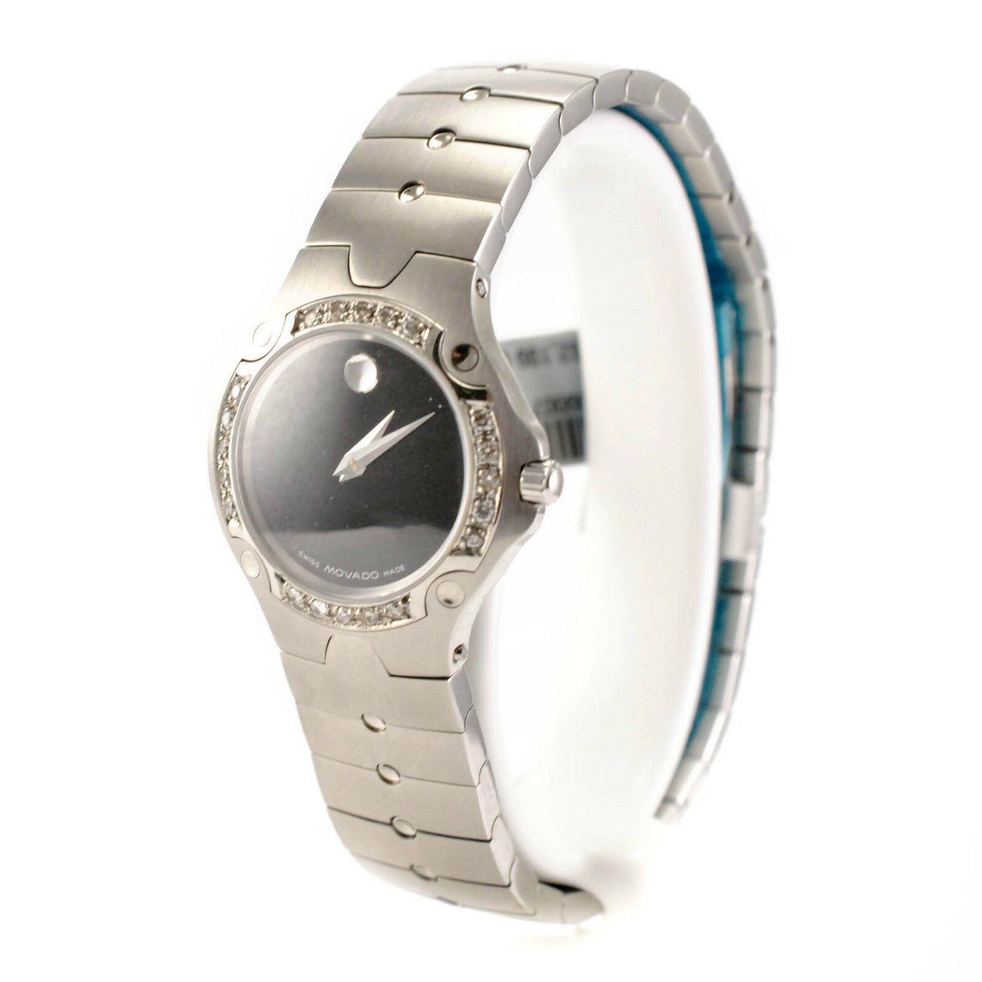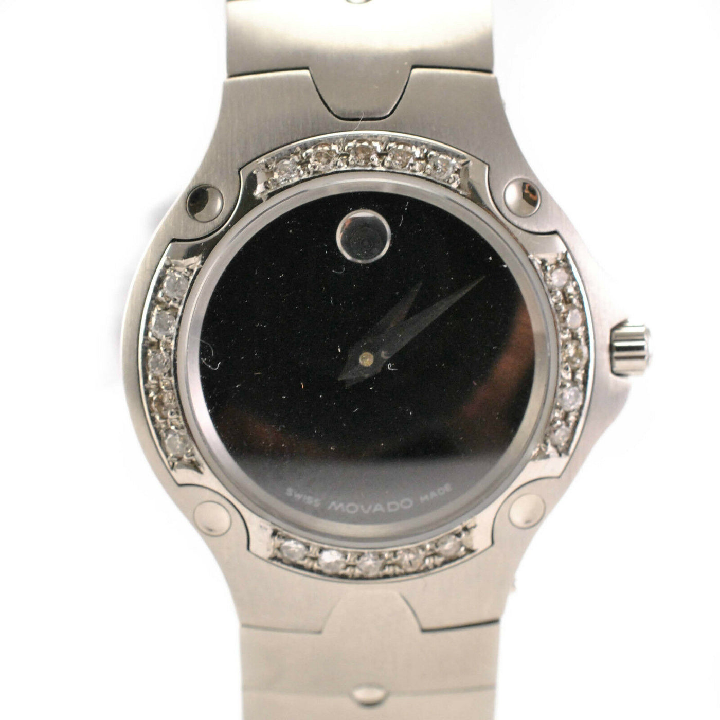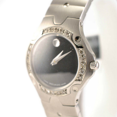 Movado 84 A1 1831 Women's Quartz Watch Stainless Steel Black Dial Diamond Bezel