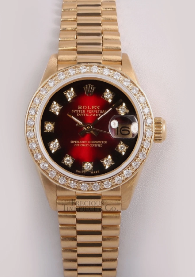 Rolex Datejust 69158 Paper Auto 18k YG President Diamond Red Dial Ladies 26mm Sale