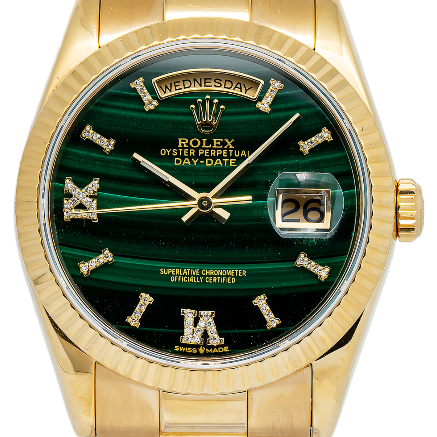 Rolex Day-Date 118238 Aftermarket Diamond 18k YG President Malachite Dial 36mm