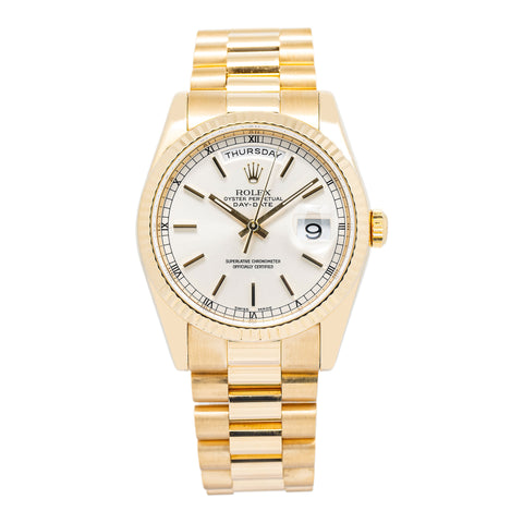 Rolex DayDate 118238 18k Yellow Gold President 2002 Auto Silver Dial Unisex 36mm Sale