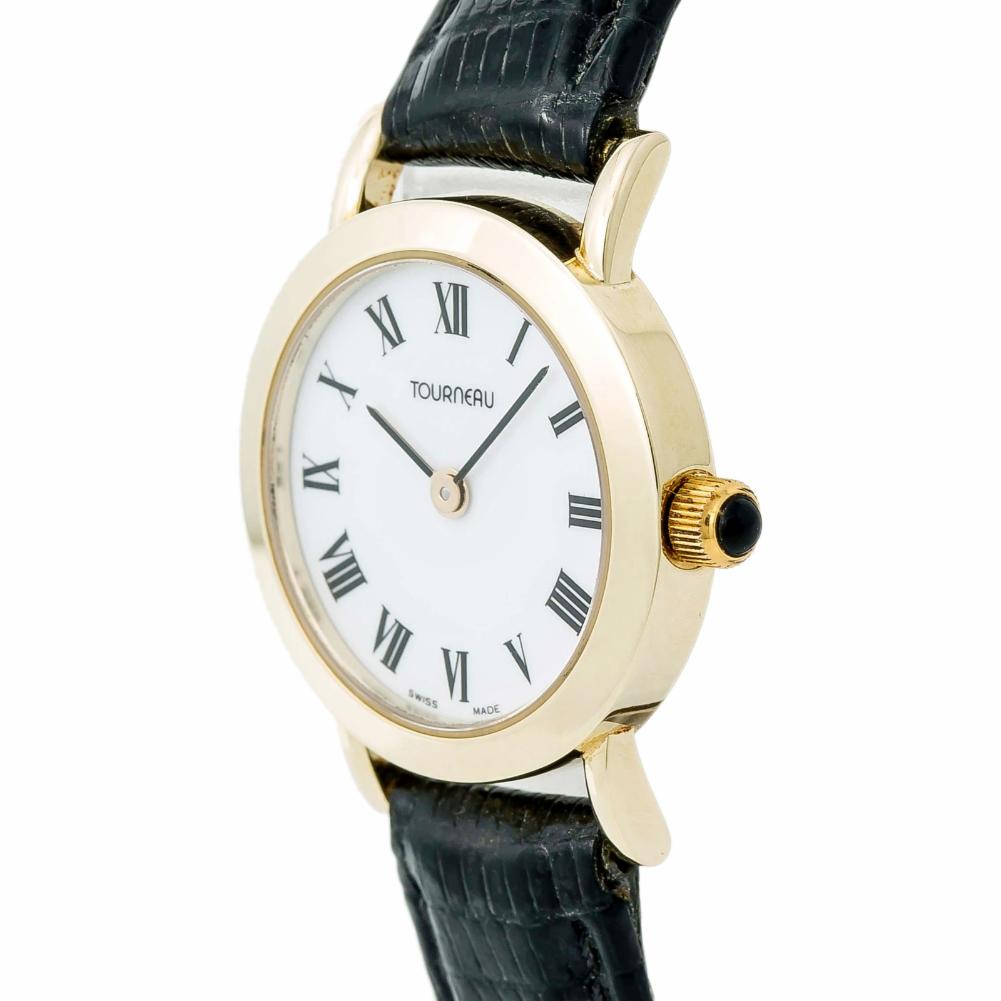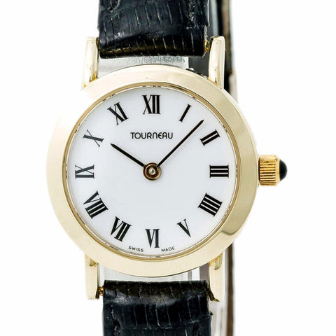 Tourneau Womens Quartz Watch White Dial 18K Yellow Gold Leather Band 23mm