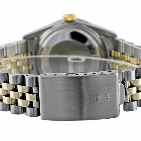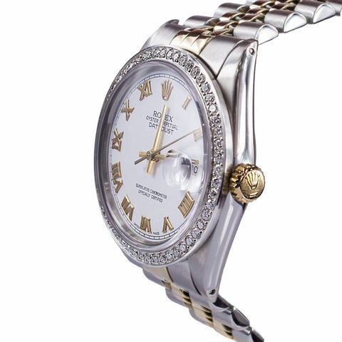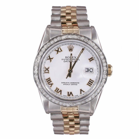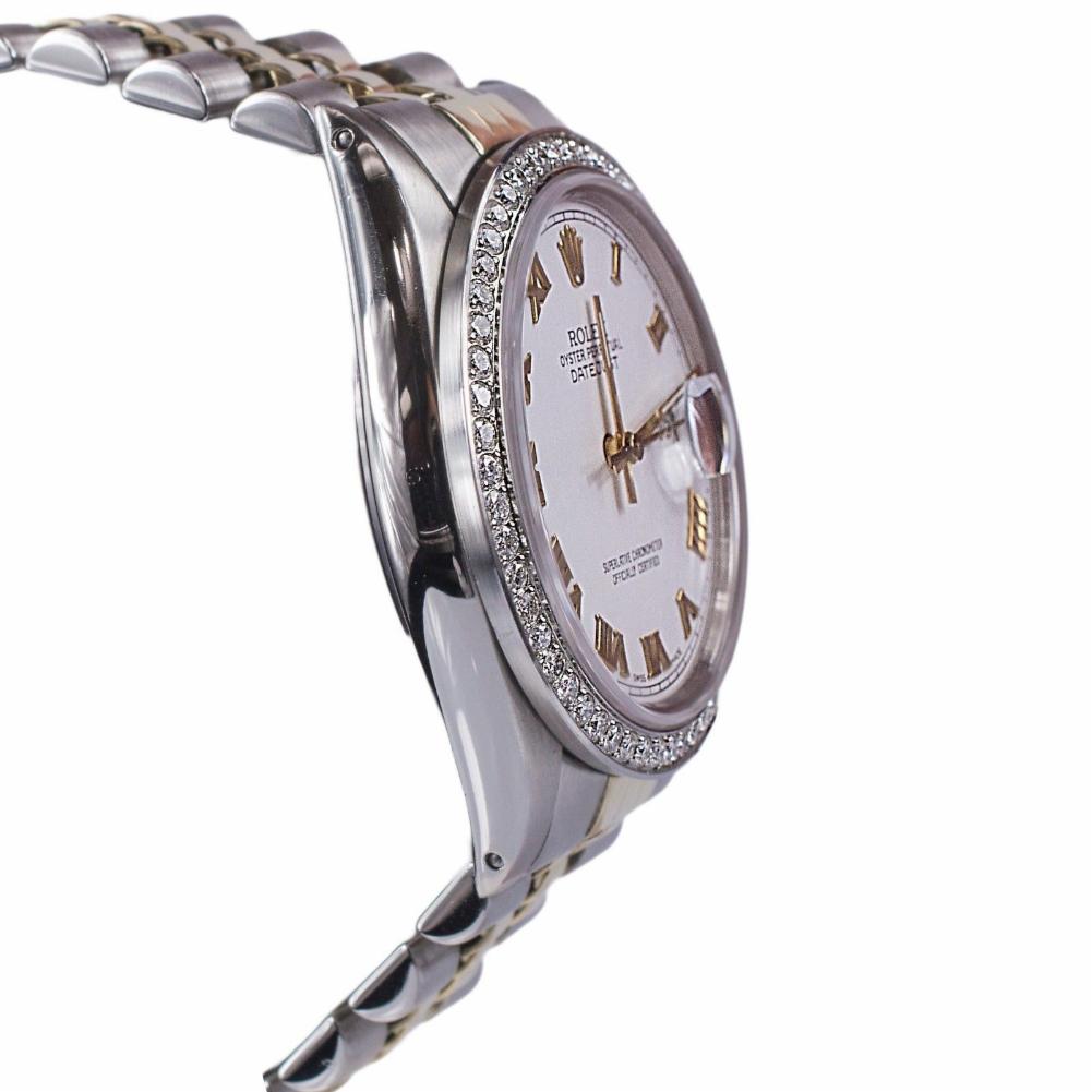 ROLEX DATEJUST 16013 AUTOMATIC MEN'S WATCH TWO-TONE 18K YELLOW GOLD AND STAINLESS STEEL 1.68CT DIAMOND BEZEL.Stainless steel 36mm case. Stainless steel and gold bezel. Band: Two Tone 18K Yellow Gold & Stainless Steel Jubilee with a stainless steel folding clasp. Automatic movement.